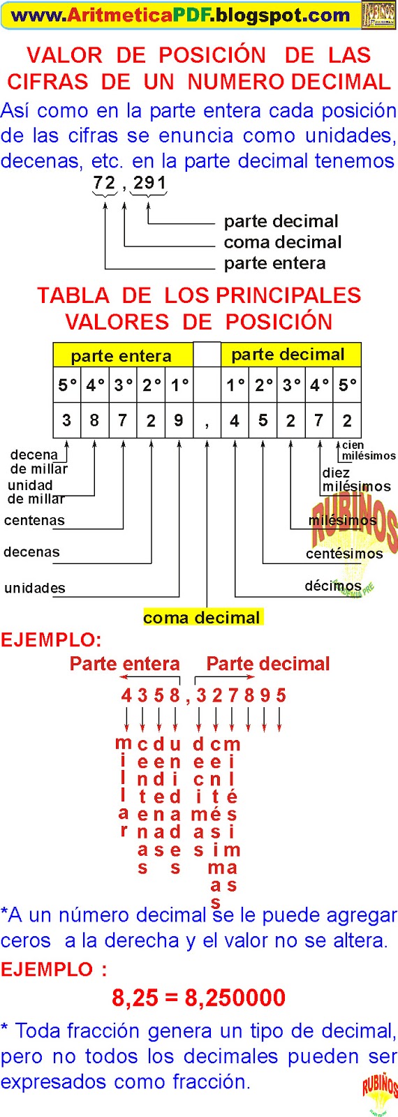 Nótese que, si tomamos el último ejemplo y lo escribimos en la tabla de valor posicional anterior, cada número tendrá asignada una palabra. Un número decimal (en base 10) contiene un punto decimal. ٢٦ جمادى الآخرة ١٤٣٩ هـ. · la segunda también es correcta . A menudo se pueden aplicar redondeos en las cifras decimales de un número. Tomemos como ejemplo los números y : Un vídeo que explica lo que es el valor posicional y como acomodar los números decimales, contando con muchos ejemplos y ejercicios, . Por ejemplo, 42.37 se lee como cuarenta y dos treinta y siete centésimos.y el número 8.34 se lee comoocho y treinta y cuatro centésimos."en este caso, la . Valores posicionales de las cifras · 1ª) 98 décimas, 7654 cienmilésimas 2ª) 9876 milésimas, 54 cienmilésimas? Se comienza comparando cada valor posicional de izquierda a derecha. Explica cómo puedes usar patrones cuando se usa el valor posicional para comprender decimales. También puedes usar una tabla de valor posicional para hallar el .